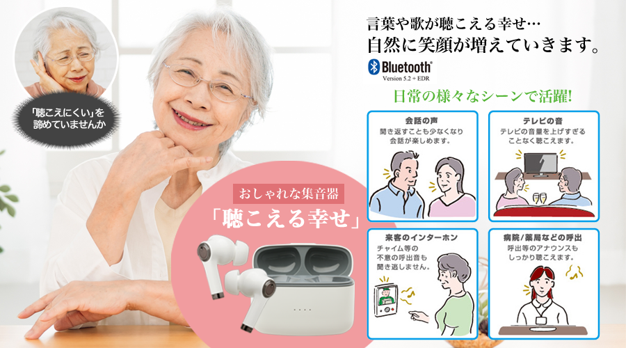 家族の話し声がよく聞こえず、意思の疎通がうまくとれなかったり、銀行や医療などの窓口手続きに時間がかかったりと、『聞こえにくくなった』という悩みの種はつきません。集音器「聴こえる幸せ」は手のひらサイズのコンパクト設計で、且つ高性能です。集音器のボリューム(集音レベル)は、イヤホンのボタンを押して5段階で簡単に調整ができます。また、ブルートゥース機能(無線通信)付きでスマートフォンなどに接続ができ、音楽再生や通話ができます。何よりも、スタイリッシュなデザインなので、いつも持ち歩きたくなる、誰かに自慢したくなる、そんな素敵な集音器です。