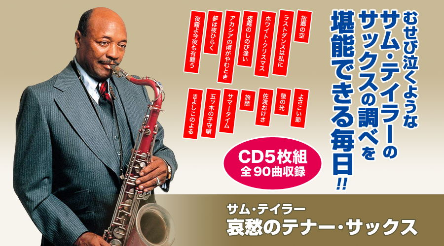 ムード・テナー・サックスの巨星サム・テイラーによる、懐メロ、ベスト・ヒット・メロディーの待望のベスト盤です。ジャズの素地を持ちながらも、哀愁あふれコブシの利いた演奏で日本人に大人気を博しているサム・テイラー。哀愁をおびた甘く切ないテナー・サックスの調べを堪能できる毎日を、あなたも、お楽しみになれます。歌は収録されていません。収録曲は全てサックスによる演奏です。カラオケ代わりに歌うも良しの豪華歌詞集付きです。ムード・テナー・サックスの巨星サム・テイラーによる、懐メロ、ベスト・ヒット・メロディーの待望のベスト盤です。ジャズの素地を持ちながらも、哀愁あふれコブシの利いた演奏で日本人に大人気を博しているサム・テイラー。哀愁をおびた甘く切ないテナー・サックスの調べを堪能できる毎日を、あなたも、お楽しみになれます。歌は収録されていません。収録曲は全てサックスによる演奏です。カラオケ代わりに歌うも良しの豪華歌詞集付きです。