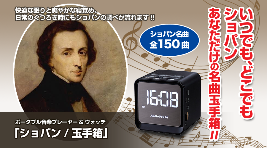 「こんなに便利な音楽プレイヤー&時計があるなんて感激です」「ショパンのファンには格別の贈り物」「外出時にポケットに入れて持ち歩いています」「寝床に愛用。朝の寝覚めが爽やか」……と、いま全国で、音声プレイヤーと時計が一緒になったコンパクトで高音質な『ショパン/玉手箱』が話題です。