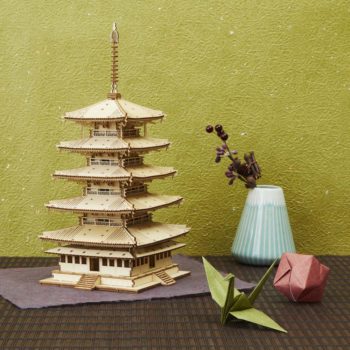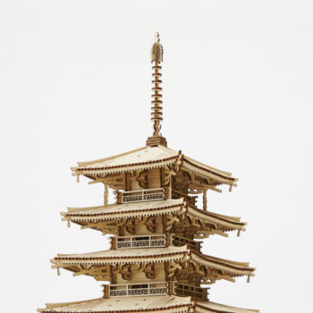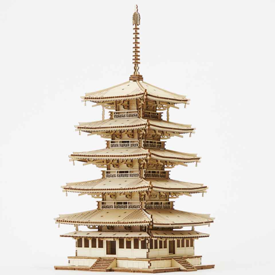 私たち日本人の宝「五重塔」木製立体パズルが登場です。カッターや接着剤など道具が無くても組み立てられる木製立体パズル。木の温もりのある親しみやすい素材でできており、重なり合う美しき楼閣が、精巧に再現されています。五重塔を構成する五つの楼閣は、下から地(基礎)、水(塔身)、火(笠)、風(請花)、空(宝珠)といいます。そのひとつひとつのパーツを組み上げていき、少しづつ形となっていく「嬉しさ」、完成に近づく「期待感」など、私たちにとても充実した時間を与えてくれます。また、完成した木製パズルは重厚感があり、凛とした佇まいで、思わずその世界観に引き込まれてしまうほどの雰囲気があります。インテリアとして飾ることもできる、まさに、組み立てる充実感と、飾る満足感に浸れる、唯一無二と言っても過言では無い素晴らしい木製立体パズルです。