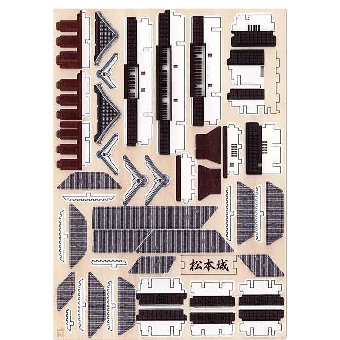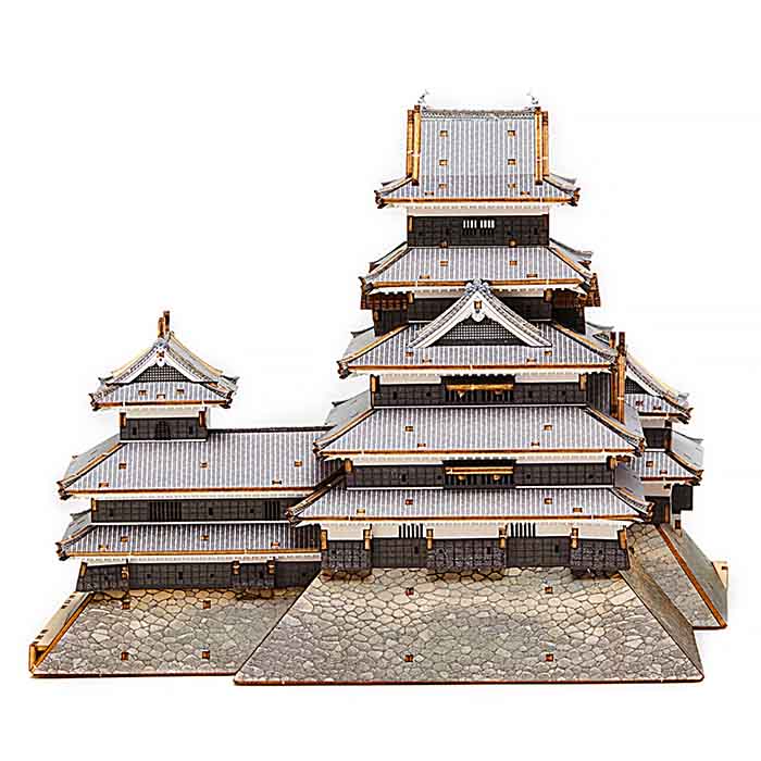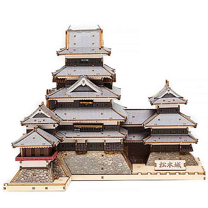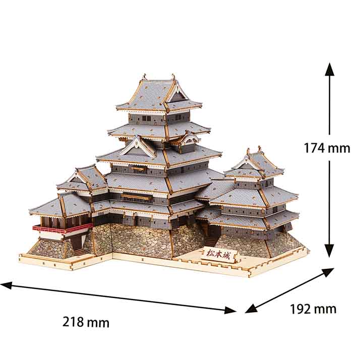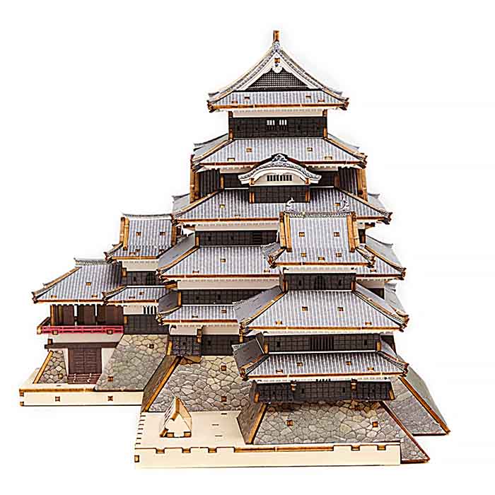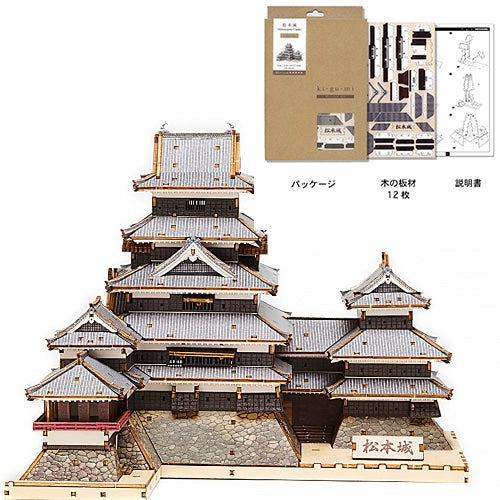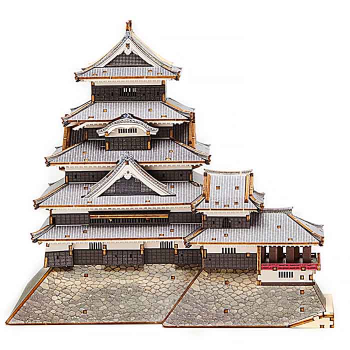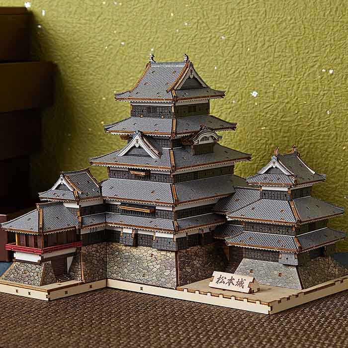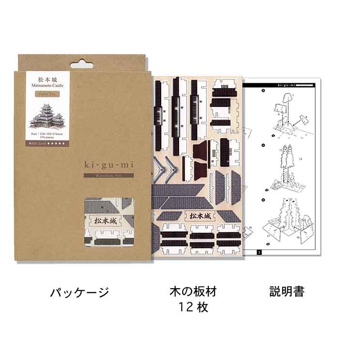 「楽しい!こんなに夢中になるとは思わなかった」「自分で組み立てた松本城を眺めている満足感がたまりません」などなど、評判が評判を呼んで、今、愛用者が急増中の木製立体パズル。ファン待望の「松本城」がカラーバージョンで登場しました。カッターや接着剤など道具が無くても組み立てられ、木の温もりある親しみやすい素材でできています。組み立てれば縦約19センチ、横約22センチ、高さ約18センチの黒と白が美しい烏城(からすじょう)『松本城』が完成し、外壁の、黒漆(くろうるし)と、白漆喰(しろしっくい)の外壁は、まるで本物のように優雅な雰囲気があり、石垣や屋根まで精巧に再現されています。このパズルはシリーズ展開されており、リピーターも多く、「姫路城」や「五重塔」「首里城」など次々にチャレンジし、コレクションされる方も多い大人気ヒット商品です。唯一無二と言っても過言ではない、この美しく魅力たっぷりの「松本城キット」を是非、この機会にお愉しみください。