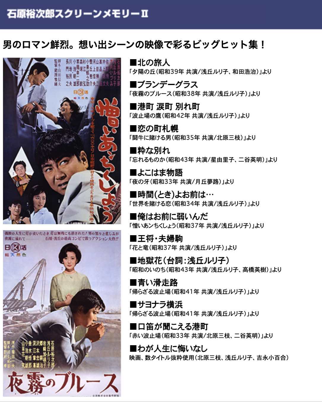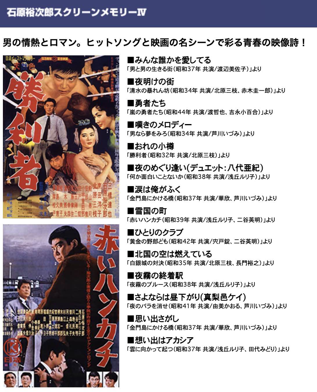 この時代に青春を過ごしたあなたなら、決して忘れられない我等が裕ちゃんの全盛時代が、眼と耳に甦ってくるから、もう、堪りません。何度でもお楽しみになれます。