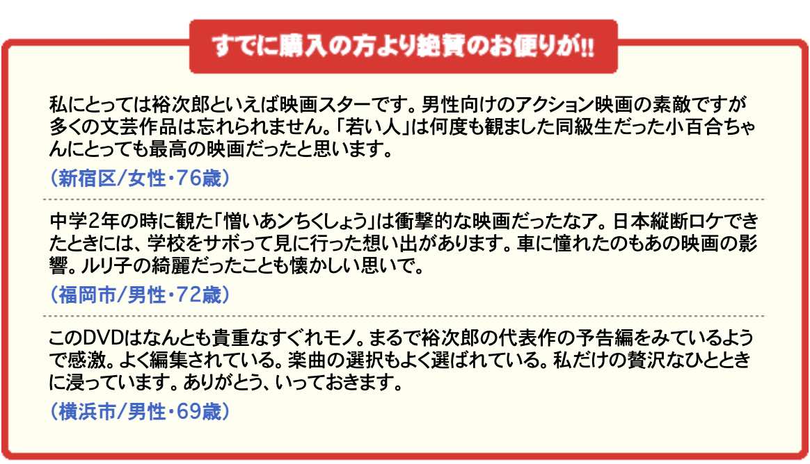 「このような映像作品を待ってました。もう、満足の極みです」「裕次郎の70年来のファンです。昔を思い出して万感の涙、涙、涙です」「最高の映像&音楽体験!友達にも自慢しています」……と、いま全国で、とくに、シニア男女に大評判です。