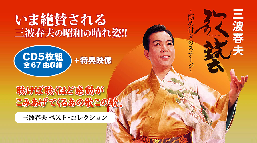 戦後の復興期を経て、東京オリンピック、大阪万国博……と、日本が輝いていた昭和のあの時代。国民歌手と呼ばれ、NHK紅白歌合戦では昭和33年『雪の渡り鳥』で初出場以来31回連続出場(当時の最多記録)、歌手として初めて例年歌舞伎座公演を実現するなど偉大な存在として自他共に認められていた三波春夫。今回お届けする『歌藝(うたげい)/三波春夫特選集』は、いつも絶やさぬ朗らかな笑顔と浪曲で鍛えた美声から繰り出される『チャンチキおけさ』や『船方さんよ』などの歌謡曲から、『東京五輪音頭』や『世界の国からこんにちは』などの大ヒット曲、『ルパン三世』や『桃太郎侍』などのテレビ主題歌、さらに『瞼の母』や『大忠臣蔵/俵星玄蕃』など真骨頂の長編歌謡浪曲まで、三波春夫ならではの厳選された名曲が網羅されています。自らの芸と観客に対する真摯な姿勢は、あまりに有名な「お客様は神様です」のフレーズを生むもととなり、いつまでもその歌声は永遠に不滅です。平成のいま、昭和のこころを満喫できる絶好の全集といえます。