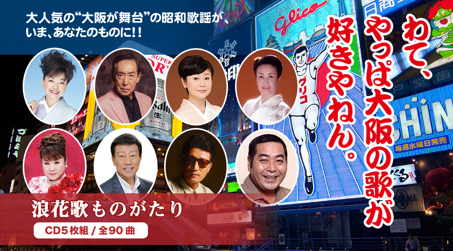 美空ひばり、都はるみを始めとし、石川さゆり、天童よしみ、中村美律子から吉永小百合、さらに欧陽菲菲、ザ・ピーナッツ、宮史郎、やしきたかじんまで、浪花を代表する歌手の名曲、浪花を歌った名曲を全90曲収録。