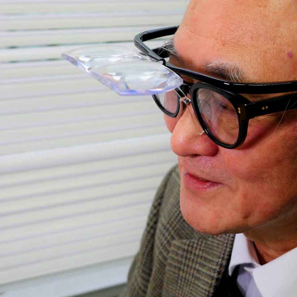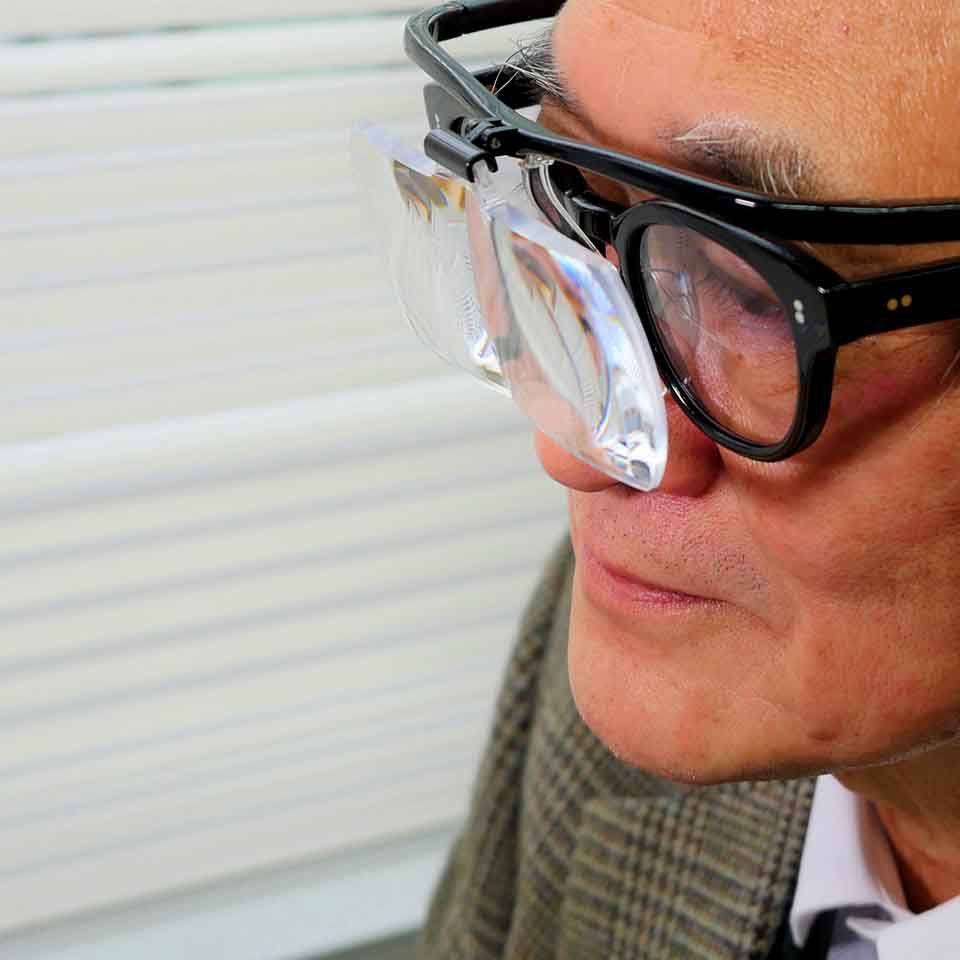 手元で大きく見える跳ね上げ式の拡大めがね。