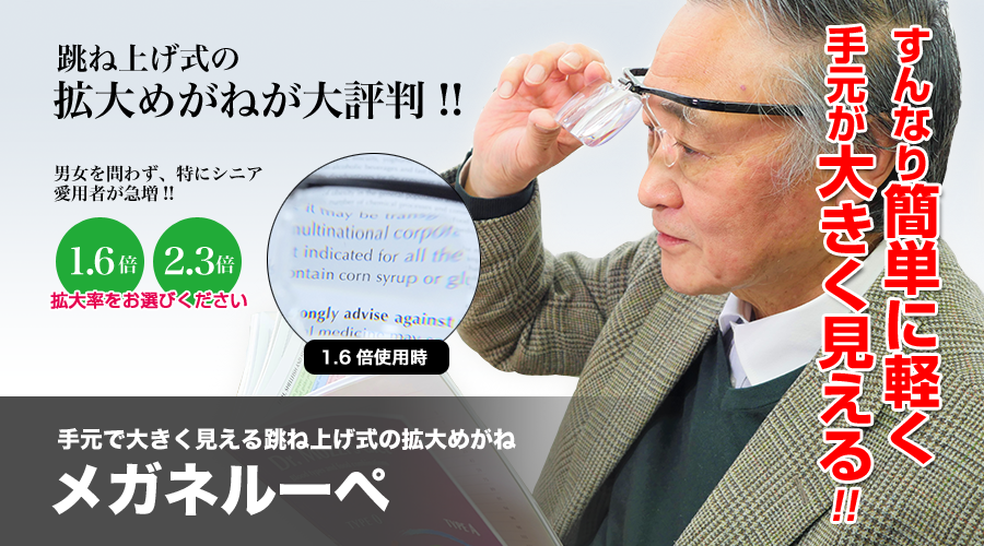 「こんなルーペが欲しかった!」と、いま、全国の中高年の間で、評判が評判を呼んで売り切れ続出なのが《跳ね上げ式》『メガネルーペ』。〈使いやすさ〉を第一に、日本人向けに開発された機能とデザイン、なかでも簡単跳ね上げ式を採用したユニークさで、「これは便利だ」「老眼にも最適だ」「日常生活に役立つ」など、愛用者は増大するばかり。有名・芸能人を始め、多くの方に愛用されています。