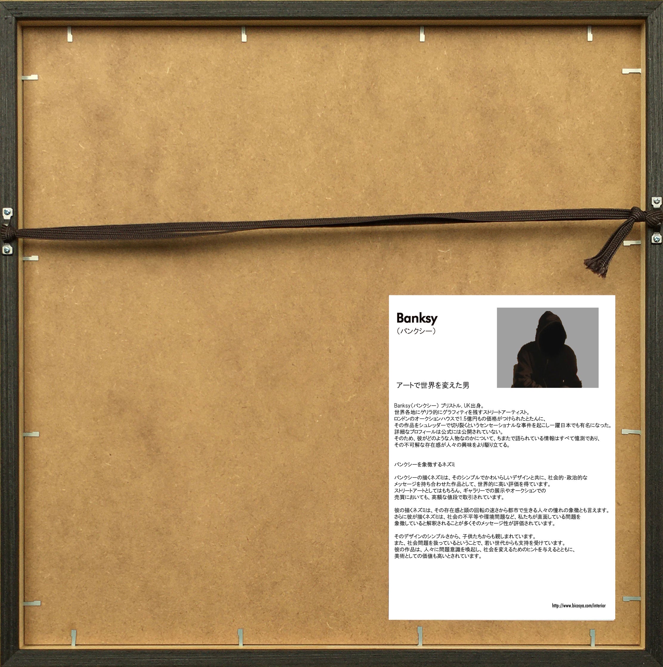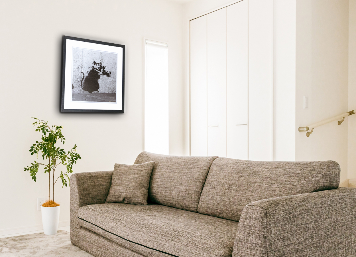 極め付きの素晴らしいアートを部屋に飾ってみませんか。取付けは簡単です。その日から部屋の様子が信じられないくらいに一新されます。気分が和みます。ゆったりできる毎日に変わります。今回お届けする作品『パパラッチ』は、いま世界中で高い人気を誇る、謎多き画家「バンクシー(Banksy)」の名画です。世界各地の建物の壁などをキャンバスに、繊細に描き続けるバンクシー。彼の作品の多くに登場する『ネズミ』をモチーフにした傑作です。監視社会やプライバシーの喪失についてのバンクシーのコメントと解釈されています。この作品では、ネズミがカメラを持っていることで、私たちが常に監視されているという考えを表現し、現代社会において個人のプライバシーが侵害されていることを示したとされています。モノトーンでどの部屋にも格調高く調和し、いつまでも見飽きることのない、深い味わいを湛えた傑作です。価格も魅力です。この機会に、ぜひ、どうぞ。